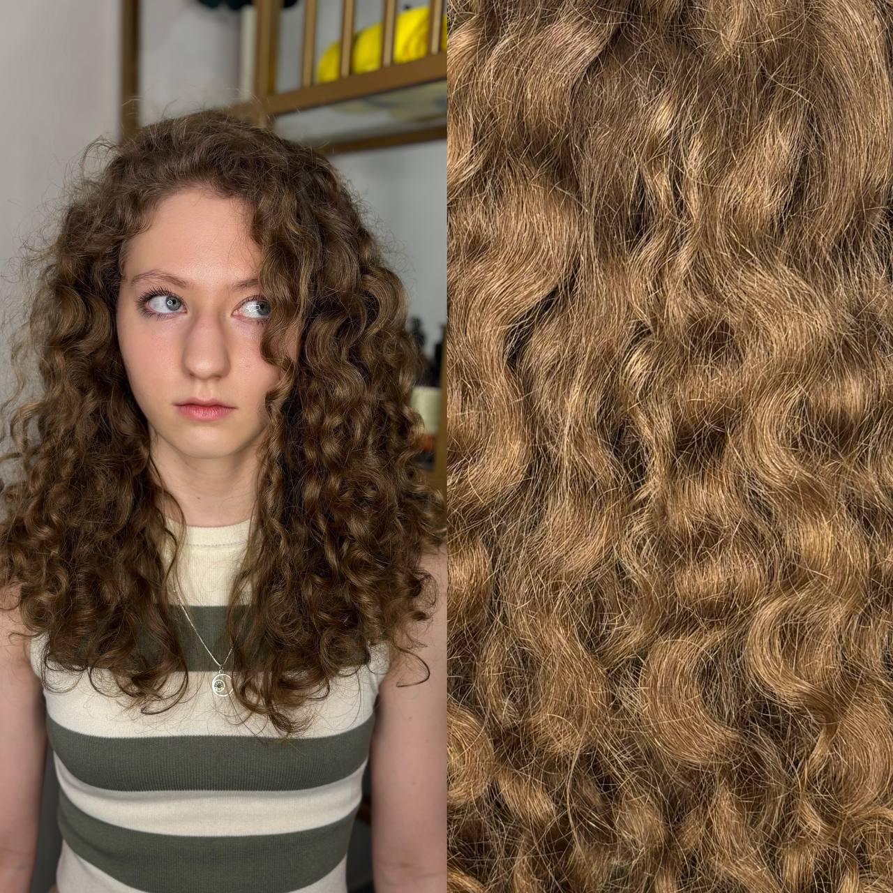Мастер оценивает структуру, густоту, пористость и вариативность завитка. Это важно, чтобы понять, где оставить больше длины, а где убрать излишек объёма.